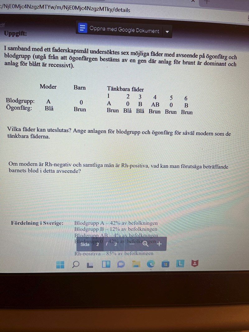 Hej, vi har en uppgift i boken om en mamma och ett barn med en typ av blodgrupp samt ögonfärg och så fick vi utesluta fädrar samt ange anlag för blodgrupp och ögonfärg för modern samt tänkbara fadern, jag skickar min lösning och uppgiften så om någon kan rätta?jag uteslöt pappa nr 4,6 samt 3 och tänkbara: 2 samt 5 då de båda har anlagen för blodgrupp 0