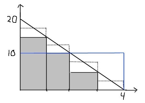 Det du gjort är att summera tre staplar som alla ligger under grafen, linjen från (0,20) - (4,0).