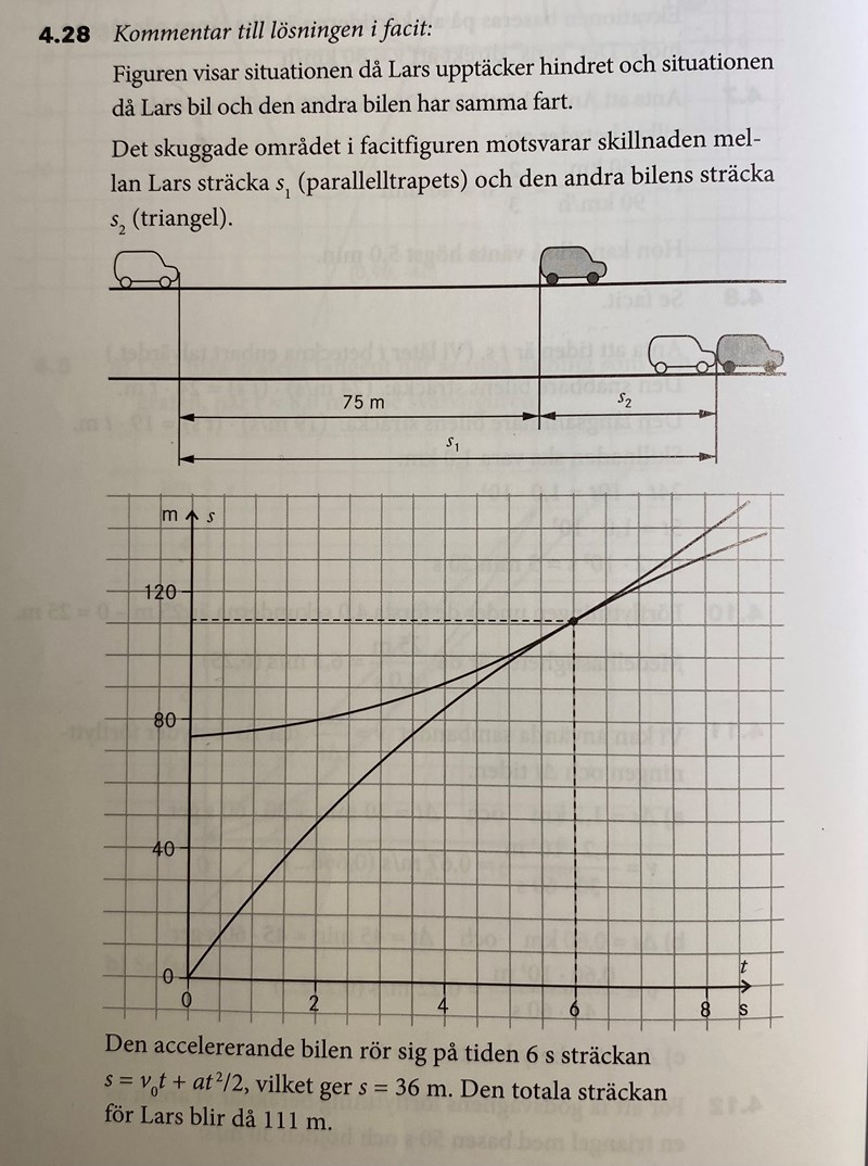 Jag förstår att bilen framför ska hinna accelerera i samma fart som Lars bil bromsar in så att kurvorna precis nuddar och inte kolliderar men vet bara inte hur jag ställer upp det algebraiskt.