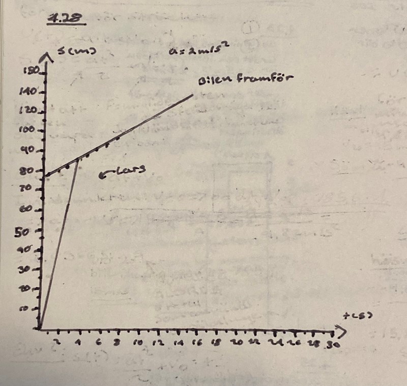 Jag ritade en graf för att se vart dem korsar, jag gör andra uppgifter än så länge men jag vill verkligen förstå denna. Jag fattar inte hur grafen inte är linjär på facit eftersom hastigheten accelererar med 2m/s alltså växer med två meter per sekund