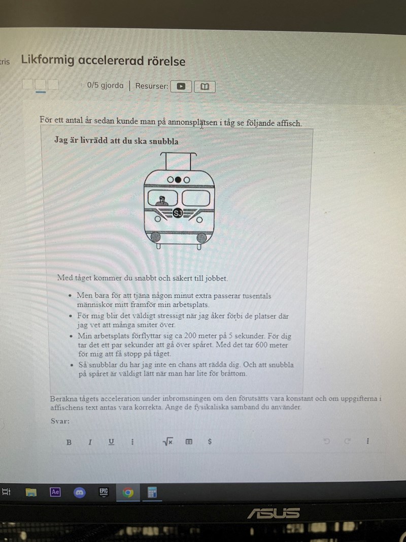 Hej, vad har jag gjort fel? rätt svar är tydligen 1,3m/s^2