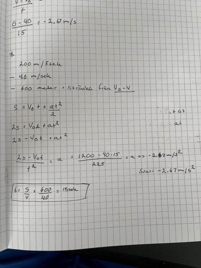 t = s/v är fel. Den formeln gäller bara vid konstant hastighet.