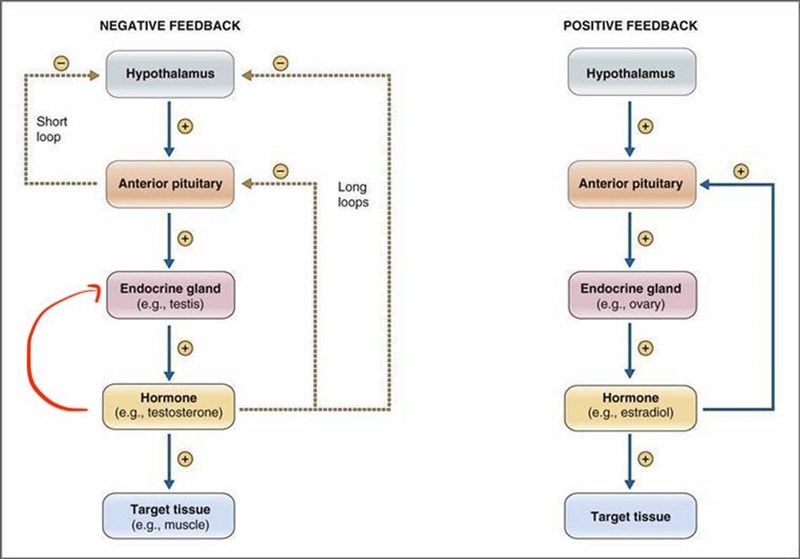 Om en endokrin organ (ex testies) producerar ett hormon (ex testosteron), kan det hormonet påverka det det endokrina organet som den syntetiserades från(testies) och skapa en negativ feedback på just det organet. La till en röd pil i bilden, stämmer den pilen?