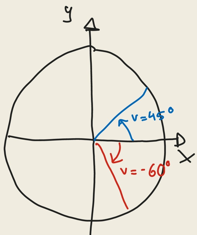 I enhetscirkeln kan vinklar vara både positiva och negativa, eftersom de räknas relativt den stråle som utgår från origo och sammanfaller med den positiva delen av x-axeln. Positiv riktning moturs och negativ riktning medurs.