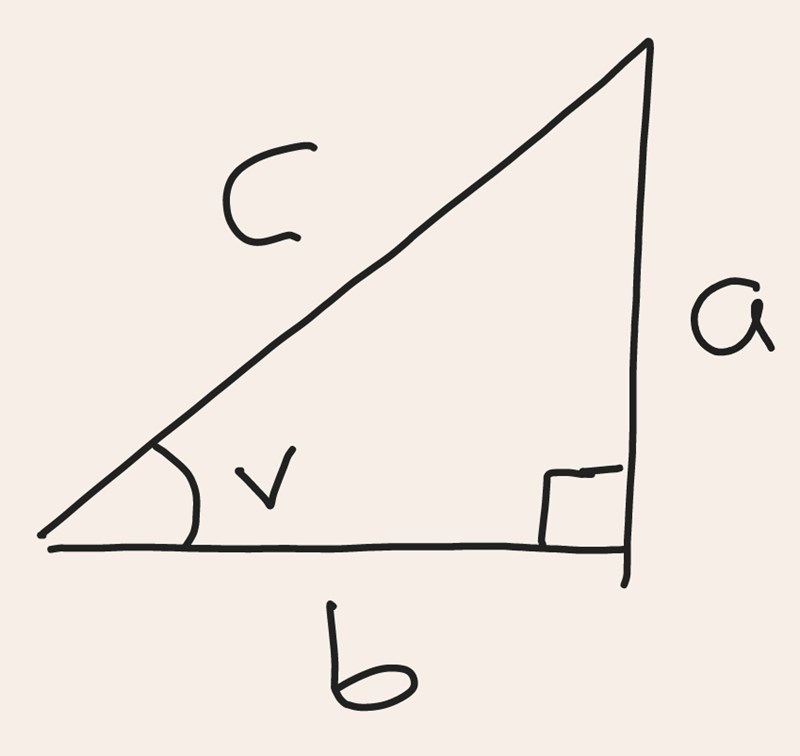 Talet man tar cosinus av är en vinkel, inte en kvot. Resultatet av cosinusfunktionen motsvarar en kvot, nämligen kvoten mellan närstående katet och hypotenusa: cos(v) = b/c.