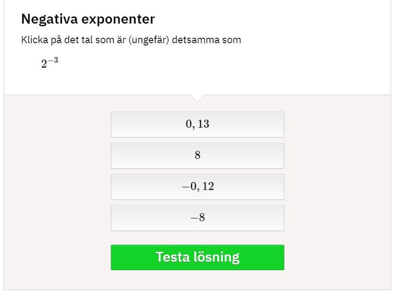 Hej, skulle någon kunna förklara för mig hur man löser denna? Jag kommer så långt att jag räknar ut att 2 upphöjt i minus 3 är samma som: 1/2upphöjt i 3. Och det är ju samma som 1/12. Men det svarar ju inte på frågan? :S