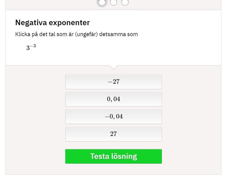Men om vi tar den här istället, den är svårare. 3^-1 = 1/3^3 = 1 /27. Men hur kommer jag fram till vad 1/27 är av de 4 alternativen? :S Sorry om jag är jobbig men jag fattar inte. Går det kanske räkna om 1/27 till decimalform på något sätt?