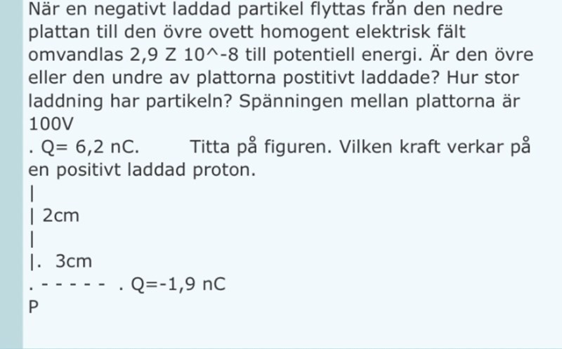 Jag antar att du menar uppgiften där partikeln förs mellan två plattor? Tänk på att det då står: