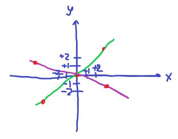 När en punkt finns i (0,0), så kan linjen se ut som den gröna eller lila linjen. Längs den lila linjen så har a och b olika tecken, så linjen lutar neråt och riktningskoefficienten är negativ.