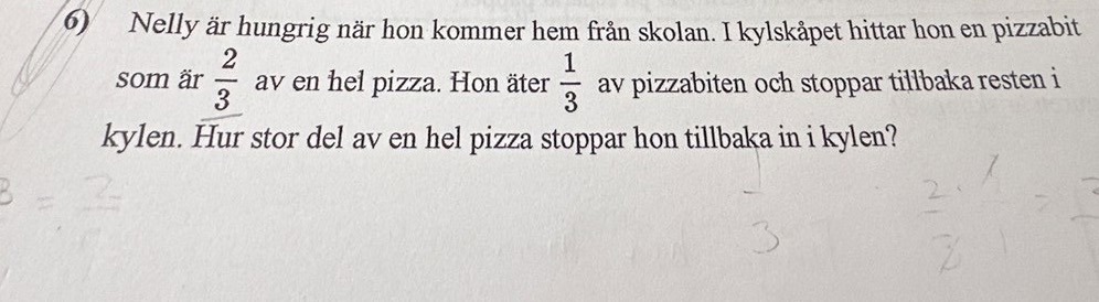 Nej vänta så hon äter 1/3 av pizzan som från början är 2/3 av en hel pizza och du säger att hon stoppar tillbaka 2/3 av pizzan tillbaks i kylskåpet men hur kommer man fram från det?