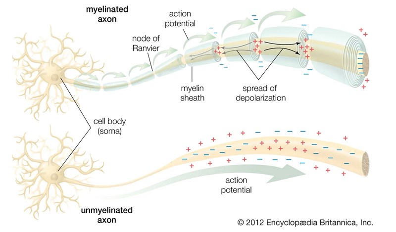 I nervcellen utan myelin (längst ner i bilden), flödar den elektriska impulsen långsammare längs hela sträckan (några enstaka meter per sekund). Så nervceller som behöver skicka snabba nervsignaler har isolerande myelin för att det skall gå snabbare, t.ex. nerver som styr musklerna och nerver i hjärnan. Andra nervsignaler behöver inte gå så snabbt och de cellerna behöver då inte ha myelin t.ex. känselceller för tryck i huden.