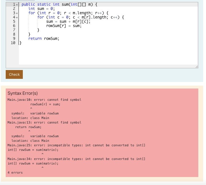 2) om rowSum vore deklarerad som som en int[] kan du returnera den med "return rowSum;" eller returnera ett värde i vektorn till exempel med "return rowSum[0]". rowSum[] är varken referensen till rowSum-vecktorn eller värde i den.