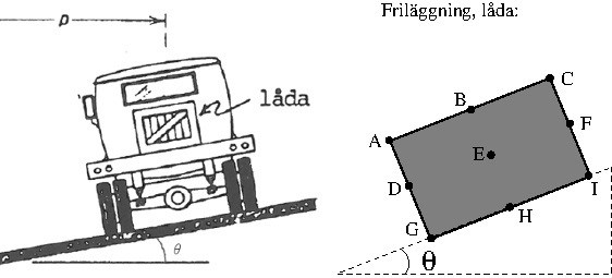En låda med massa m ligger på ett lastbilsflak. Lastbilen kör i en doserad kurva med farten v, se figur. Lutningen på vägbanan är ∅, och bilens bana har krökningsradie rå. Det finns friktion mellan flaket och lådan. Lådan ska förbli på flaket. Räkna med tyndgaccelerationen g = 9,806 m/s^2