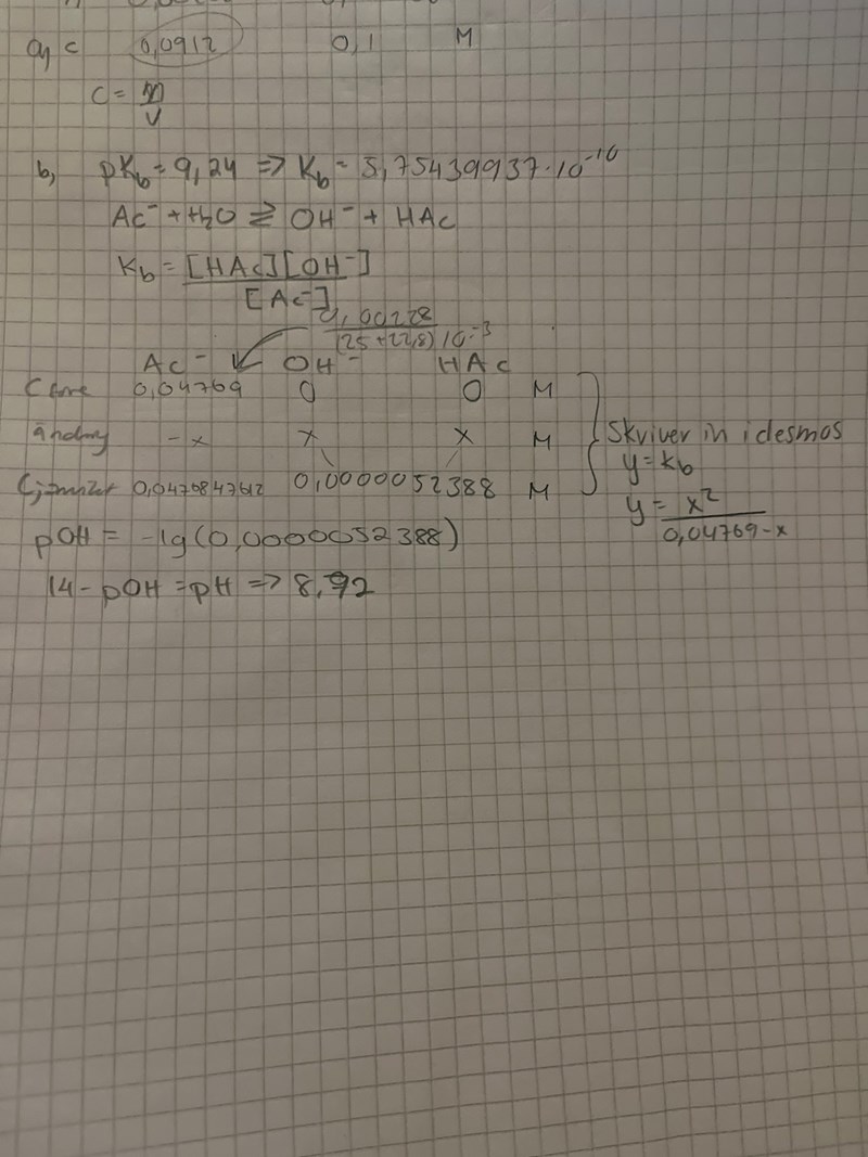Det ser ut som att du beräknar ättiksyrans ursprungliga pH, men man frågar efter pH vid ekvivalenspunkten. Då kan du tänka att du har en lösning av natriumacetat där acetatjonen med pKb=9,24 kan reagera enligt