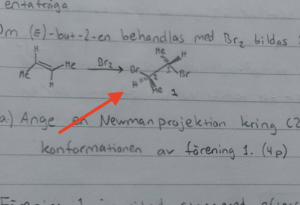 Men för kol 3 ser det inte rätt ut, för i din ritade struktur (från uppgiften) blir ordningen samma (Br, Me, H medurs) om du betraktar substituenterna längs bindningen mellan C2-3.