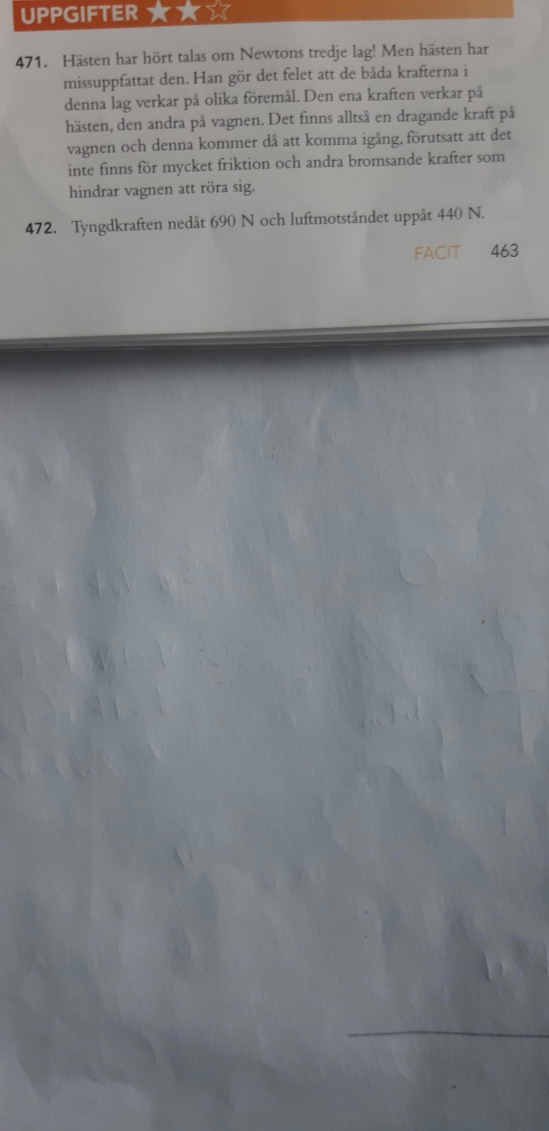 Det de menar i facit är att hästen missuppfattat Newtons tredje lag då denne tror att krafterna som beskrivs av lagen kan ta ut varandra som om man räknar ut en resultant: