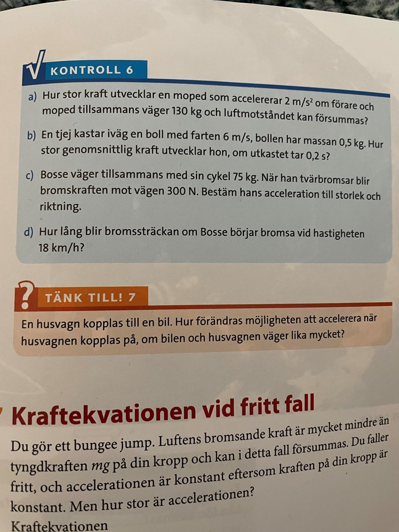 Koll med formeln v2-v02 = 2as: 52- 02 = 2.4.s => s = 25/8 = 3,125 m så det stämmer. Bra bromsar han har, Bosse!