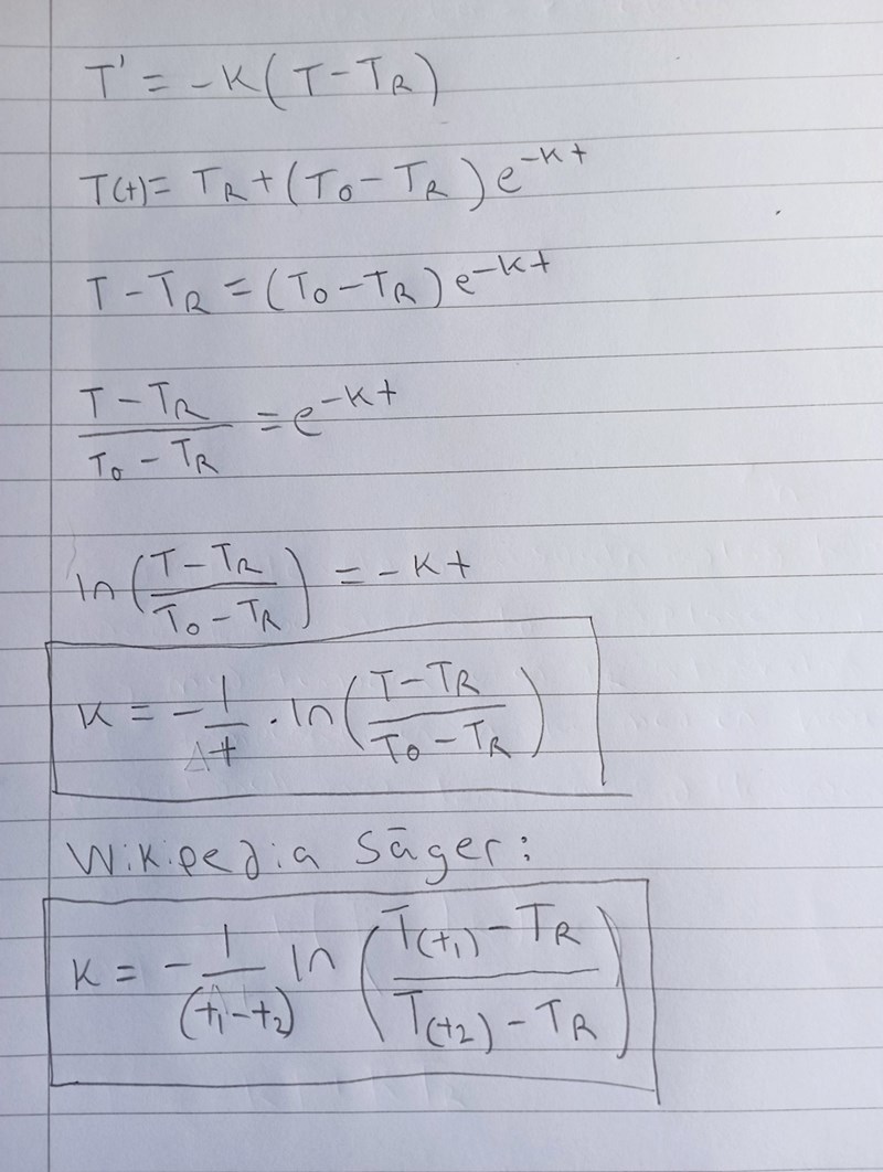 Varför är t i deras inte delta t, dvs. t2 - t1, annars får man väll ett negativt tal? Och varför (T(t1)-T(t2)) när jag har fått (T-Tr/T0-Tr)? Förstår inte.