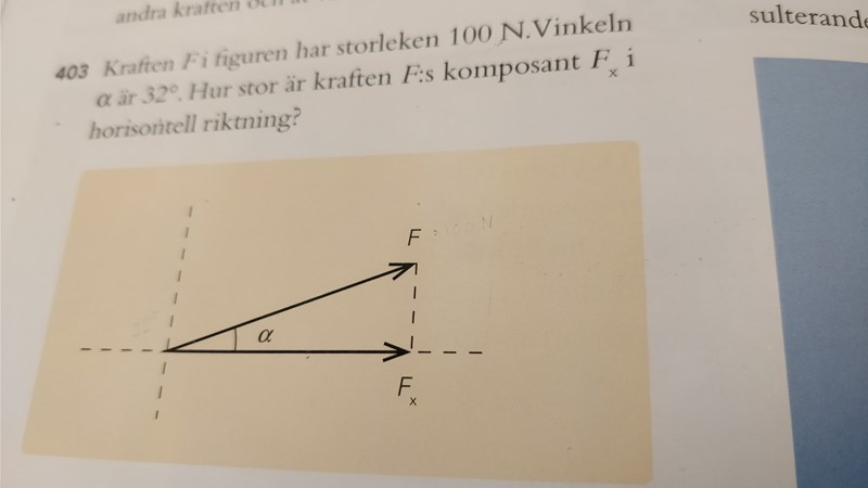 Kraften F i figuren har storleken 100N. Vinkeln a är 32°. Hur stor är kraften F:s komposant Fx I horisontell riktning?