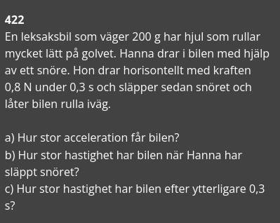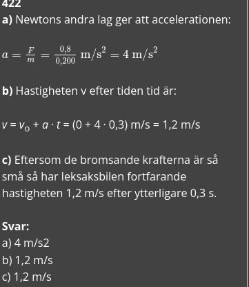 Pieter Kuiper skrev:Hejsan266 skrev:Hej, jag förstår inte riktigt hur de löste c. De skriver att eftersom skillnaden är så liten kan man säga att hastigheten efter 0,6s är lika med den efter 0,3. Varför?