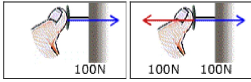 Om tummen påverkar spiken med en kraft F så påverkar spiken tummen med en lika stor men motriktad kraft -F. Det som bestämmer om spiken kommer accelerera eller inte beror på om kraften F är större än den friktionskraft f som uppkommer mellan brädan och spiken.