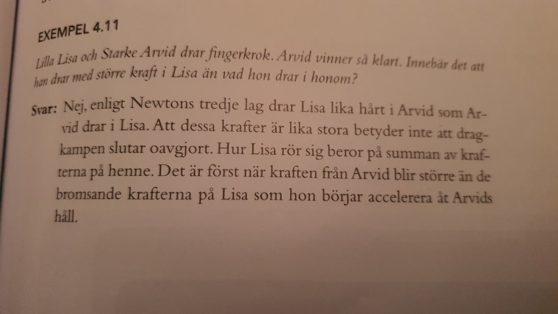 Så båda är lika starka, drar med samma kraft. Men bara för att en är lite lättare kommer den förlora. Det är skumt måste jag säga. Jag antar att antingen min tolkning av boken är fel eller att boken själv är fel.