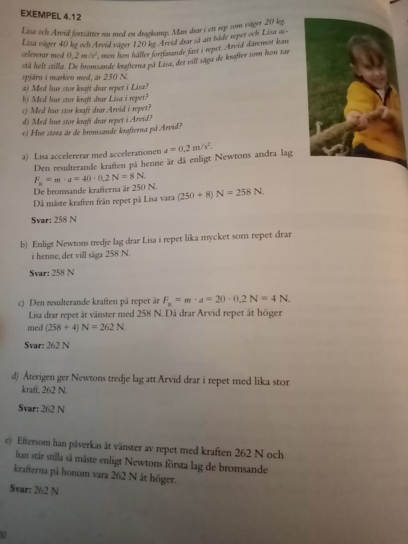 När jag försöker lösa b såsom c funkar det inte, den restulerande kraften på repte är 20*0.2 = 4N i både b och c. Men om vi tar bort 4 från 258 får vi 254N????
