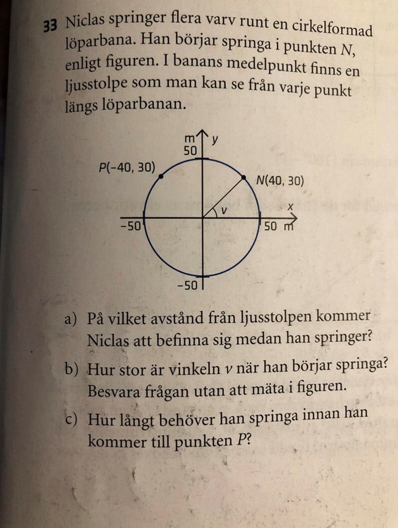 Jo, försök. Det är viktigt att du inte ger upp så fort på uppgifterna. Du kan nu räkna ut vinkeln mellan det svarta strecket och det röda strecket. Då kan du räkna ut hur lång bågen mellan N och P är. Du vet att ett helt varv är 100 m långt. Hur stor del av hela varvet är bågen mellan N och P?