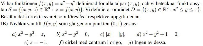 Läser också flervarre atm men nivåkurvan till f(x,y) genom (0,1) ges väl av alla punkter i xy-planet (R^2) som löser ekvationen x^2 - y^2 = -1 ? Alltså d). z = -1 är väl snarare ett plan i R^3