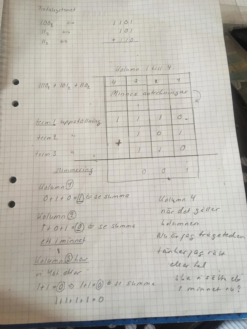 Jag ska fundera, hur jag kan förklara vad jag tänker och hur. Kanske måste göra noggranna ritningar på det hela. Det här var inte lätt. Vanlig addition är inget att tänka på. Det hjälper inte till den här typen av räkning. Man vet från tidigare att man sätter något i minnet, men det säger ändå inget eftersom det här är konstigt sätt att räkna på det hela. Lättare är det ta decimala systemet först och sedan skriva efteråt det andra. Nu vill jag lära mig även det här konstiga sättet. Jag undrar, vart behöver man sådana här räkningar. Det här måste vara påhittade saker som man aldrig har ens användning i någonstans.
