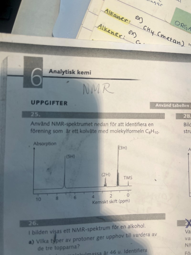 Vilka strukturer eller ämnen ger toppar mellan 6 och 8.5? Varför är det fem väteatomer där?