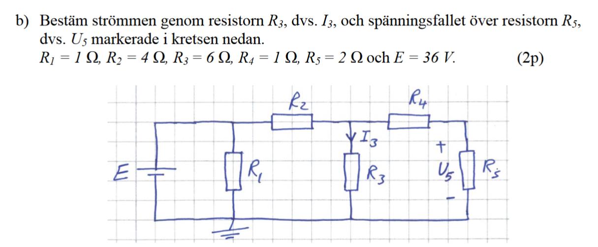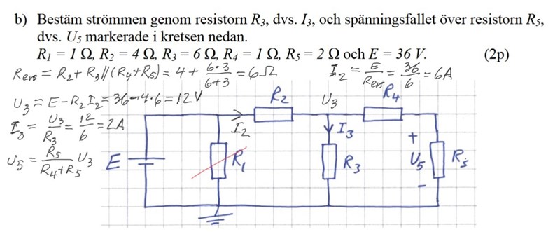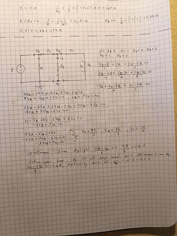 Tjenare har försökt lösa denna fråga ett tag nu med nodanalys då jag anser att det passar denna fråga. Har nu försökt lösa den på flera sätt och varje gång får jag fel svar nu undrar jag om det är möjligt att lösa frågan med nodanalys och om det går så undrar jag vad jag gör fel. Facit finns på bild längst ner: