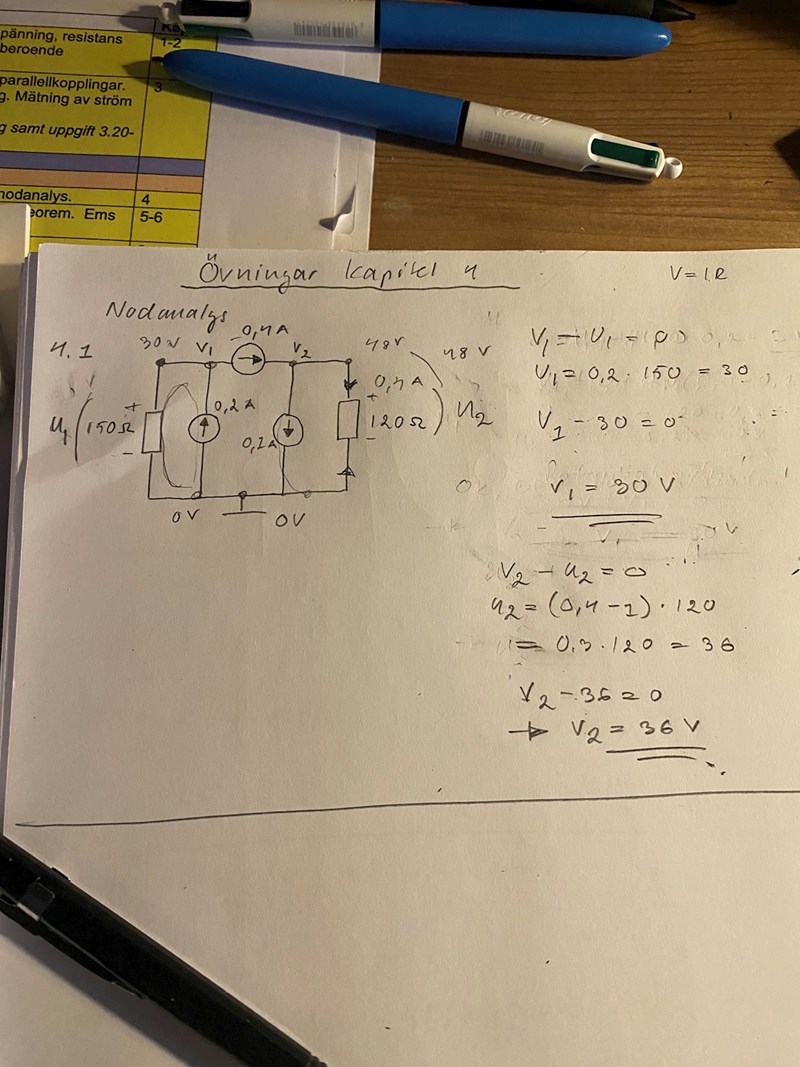 Jag lyckas få fram rätt siffror för potentialerna i noderna V2 och V2 men för V1 får jag ett teckenfel, det ska vara -30V. Gör jag något fel när jag potentialvandrar eller tilldelar jag resistorerna fel polaritet? Eller kanske är det strömriktningen jag rör till? Hjälp behövs och skulle uppskattas något enorm! :) Jag postar även en bild på min lösning.