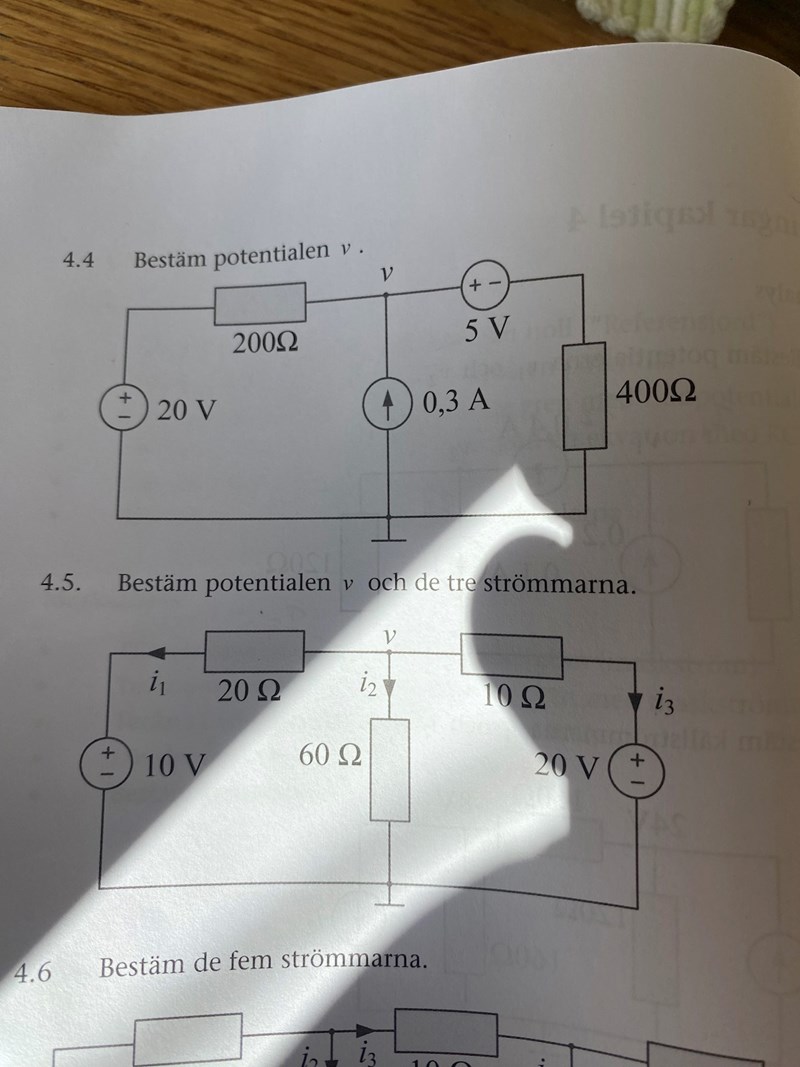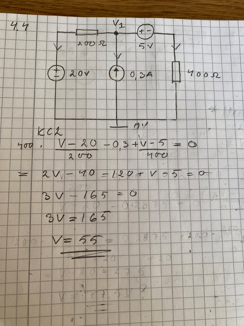 Jag får verkligen inte ihop uppgift 4.4. V1 ska erhålla en potential på 55V men jag får endast detta att stämma om resistorn till höger skulle vara på 40 ohm men då den erhåller en resistans på 400 Ohm rasar mina beräkningar ihop som ett korthus i en orkan… Förmodligen har jag missat något väsentligt…
