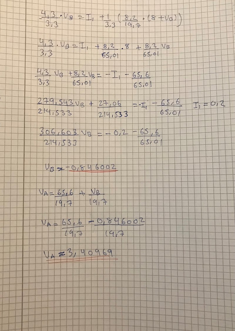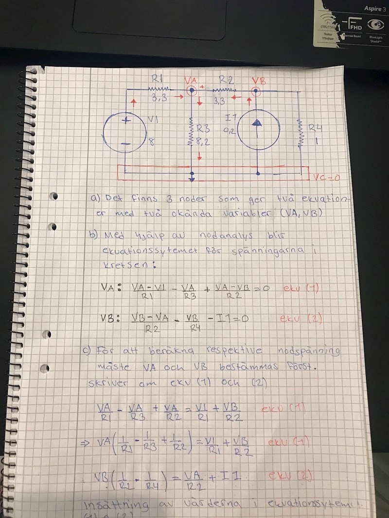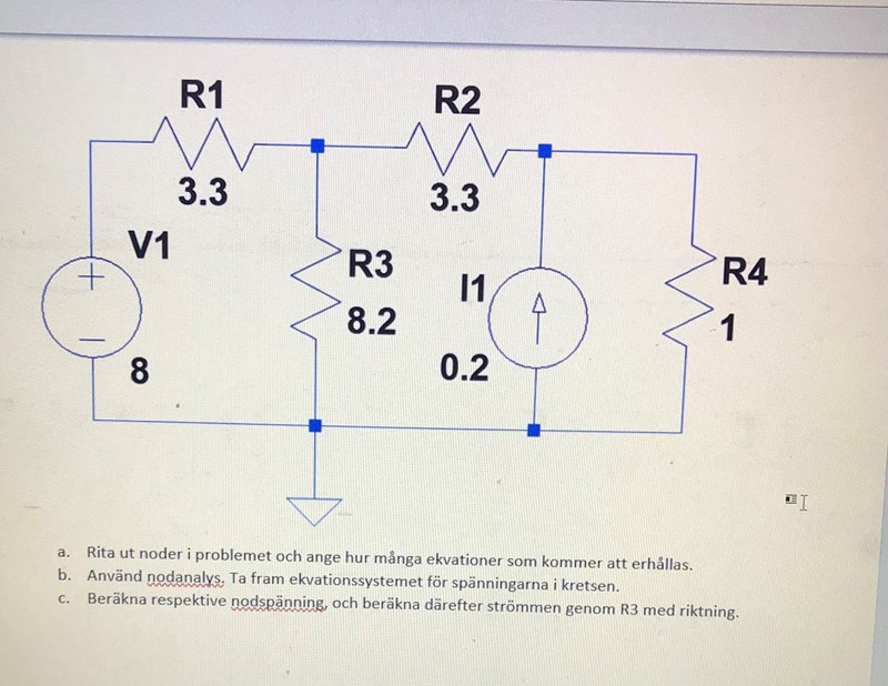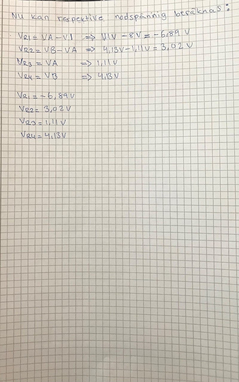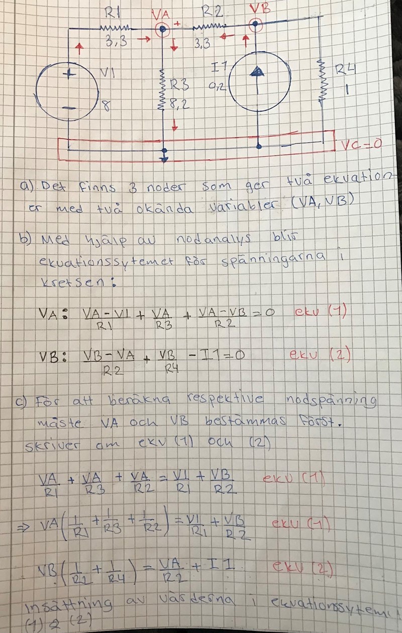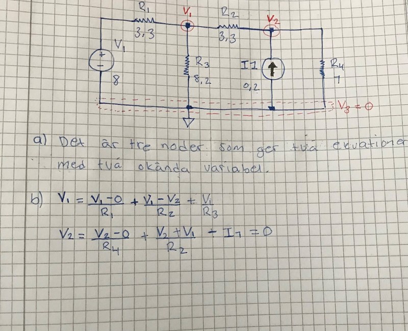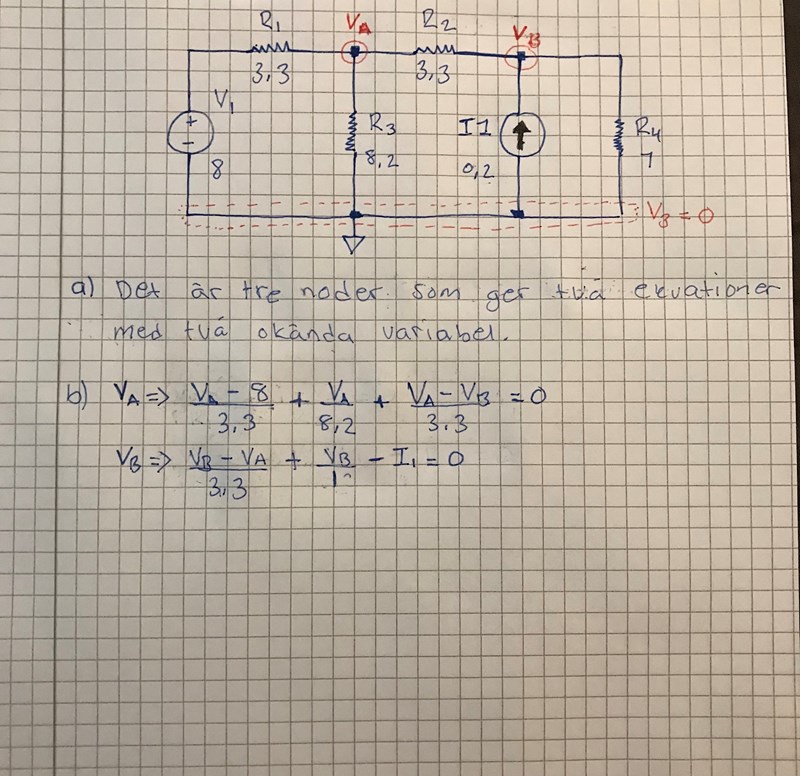 Det visade sig att min lösning var fel, nu har jag räknar om. Men jag har fastnat på uppgift C. Jag har räknat respektive nodspänning, men vet inte riktigt hur jag ska ränka strömmen som går igenom R3. Någon som kan hjälpa mig?