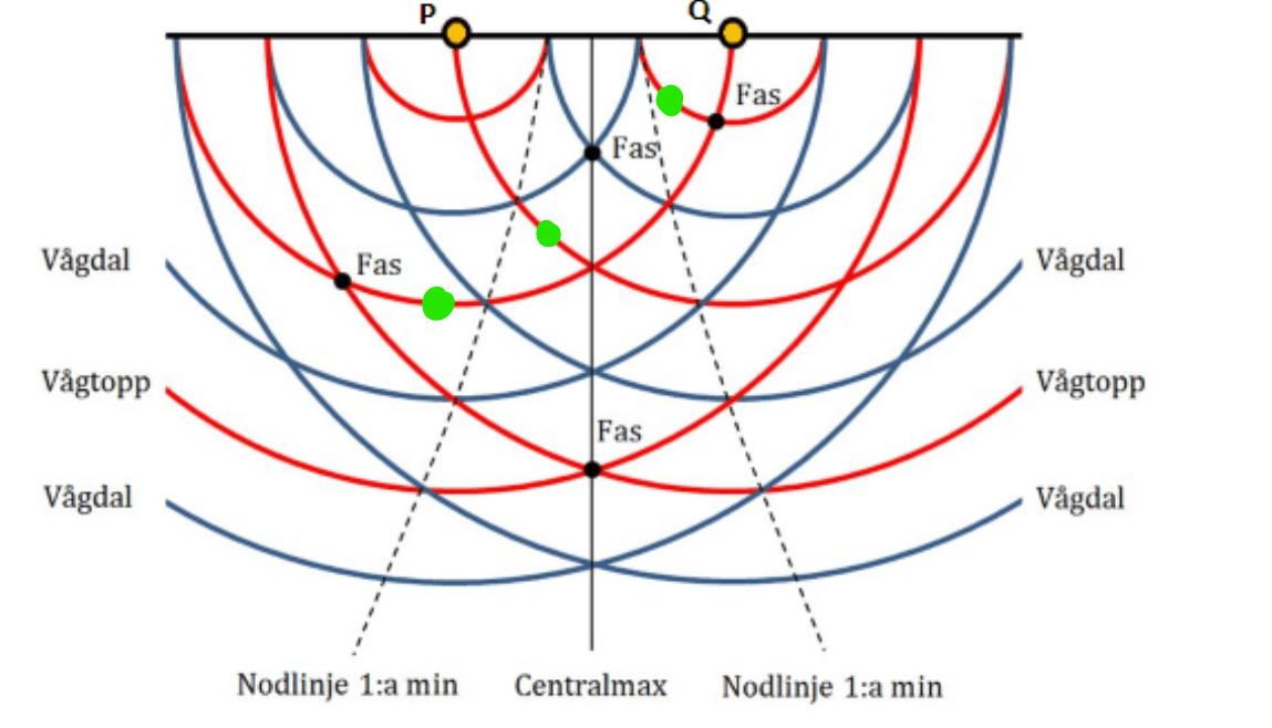 Är det rätt nu?Du ritade inte. Du tog en bild (källorna heter P och Q) där avståndet mellan källorna är 1½ våglängd. Det stämmer ungefär med uppgiftens mått, men inte noggrant nog.
