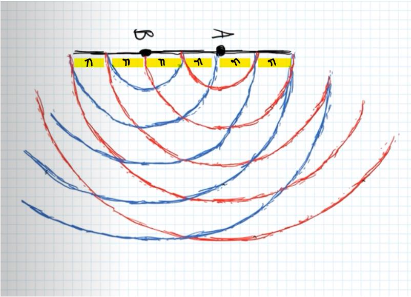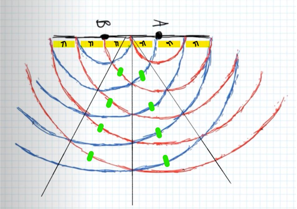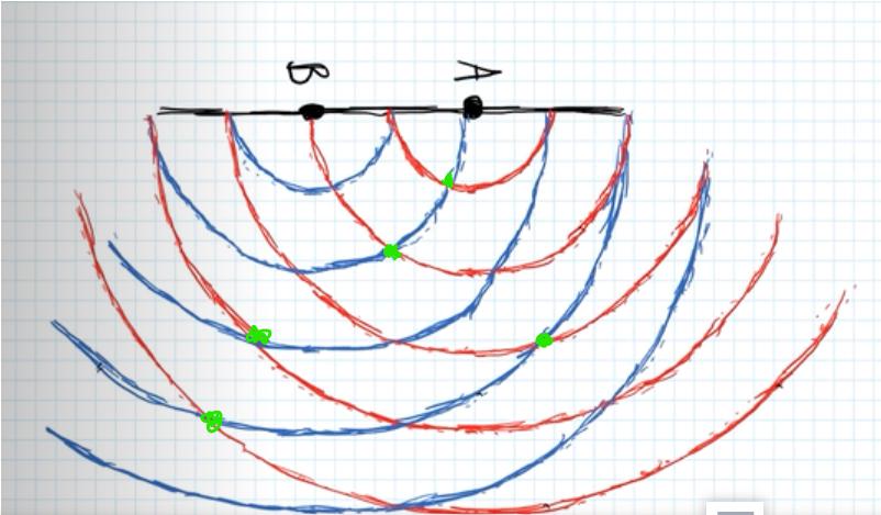 - På ställen där det blir relativt tyst, det vill säga nodpunkterna, måste det gälla konstruktiv interferens mellan de två ljudvågorna från ljudkällorna A och B? är det rätt?Du har ju en våglängd. Om man ritar vågfronter som du nog gör det är det avståndet mellan cirklarna. Och det ska då vara på samma skala som avståndet mellan vågkällorna.