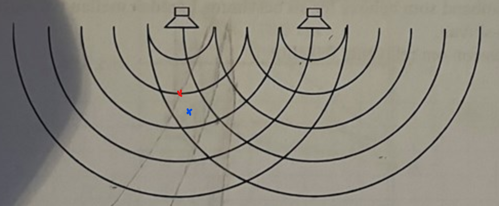 Ja, man kan säga att varje halvcirkel är en vågtopp, eller luftförtätningsmax, skapat av ena eller andra högtalaren. I punkter där två sådana halvcirklar möts ligger förstärkningsmaximum, dvs högtalarna samverkar hela tiden med varandra.