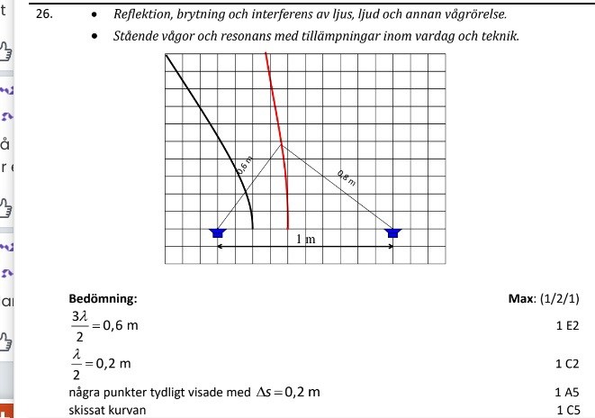- i figuren ser man att nodpunkten som tillhör andra nodlinjen och ligger på den horisontella linjen mellan högtalarna har avståndet 0.2m till den vänstra högtalaren och avståndet 0.8m till den högra högtalaren. Skillnaden i avståndet till högtalarna är alltså 0.8-0.2=0.6m. Dvs 3/2*lambda=0.6m och därmed kan man räkna ut att lambda/2=0.2m vilket är skillnaden i avståndet till högtalarna för nodpunkter som tillhör första nodlinjen.