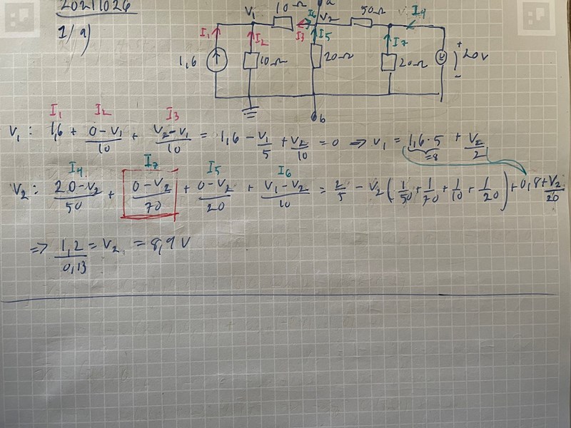 På nod 2 får jag inte samma uppställning på strömmarna som lösningsförslaget får. På min lösning har jag kallat strömmen jag gör fel på för I7, inringat med rött. Jag förstår att den är fel men vet inte hur jag annars ska räkna med den. I lösningsförslaget tycker jag att det ser ut som att de helt har bortsett från den. Ska jag på något sätt räkna samman den och I4 (längst till höger)? Eller är det korrekt att bortse från den?