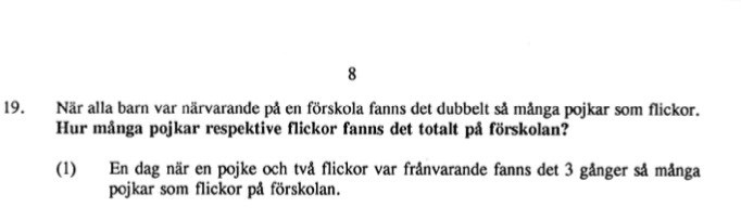 Jag tänker att vänsterledet ska vara 3F-3 eftersom pojkarna är P=2F och flickorna är F och tillsammans blir de 3F men nu är det ju ett bortfall på 3 elever och därför blir vänsterledet i ekvationen 3F-3. Men hur ska jag ställa upp högerledet utefter den informationen jag får från (1)? Jag har försökt själv men det blir inte rätt svar. Jag tänker att P=3F (pojkarna är 3 gånger fler än flickorna) men hur ska jag utveckla detta och ta hänsyn till ett bortfall på 1 kille och 2 tjejer?