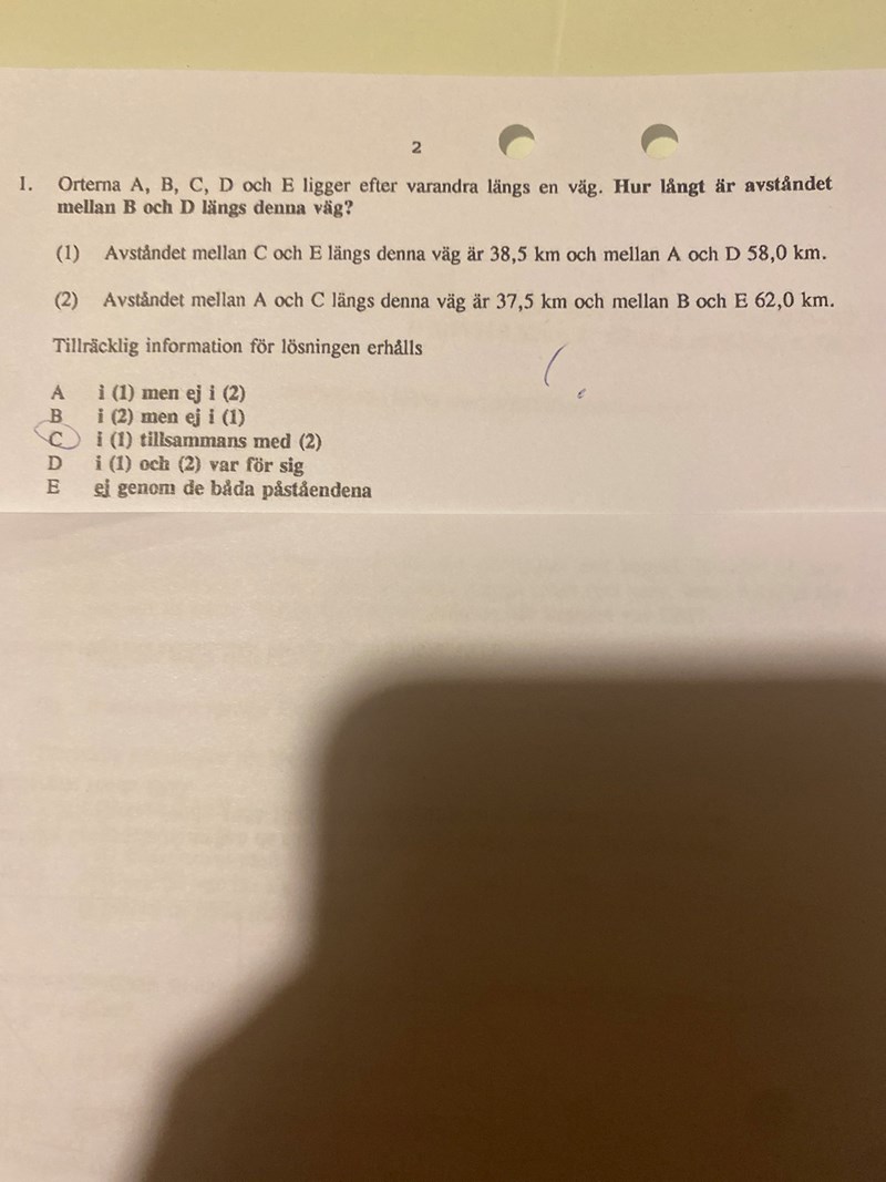 E.E.K skrev:Bubo skrev:Om ABCDE ligger i just den ordningen längs vägen så är C rätt svar.