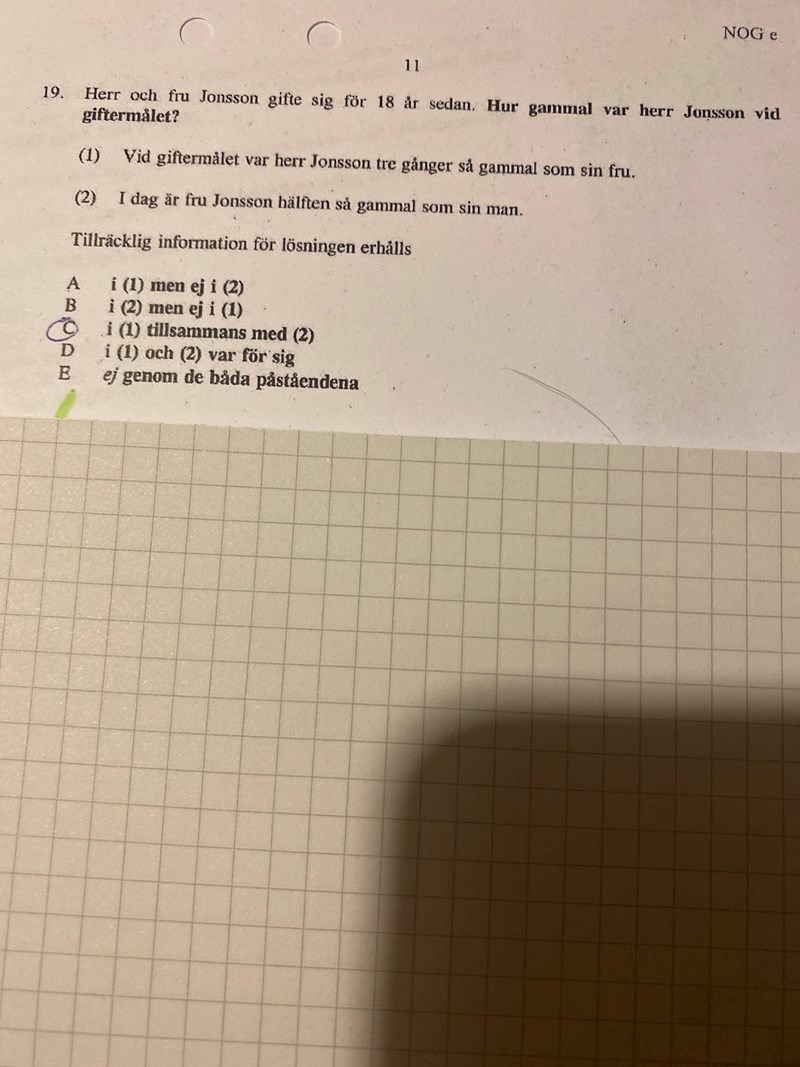 Mmm det är just det jag tycker är svårt att veta hur de två ekvationerna från (1) och (2) ska förhålla sig till varandra i och med att i (1) var för 18 år sedan och i (2) utspelar sig nu.