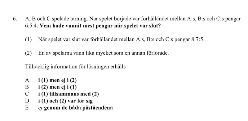 Lika stor andel på spelare A? Den enda spelaren vars andel ökade är spelare B. Spelare C’s andel minskade. Därför är ger kvantitet 1 en lösning, men inte 2. Och alternativ A är rätt?