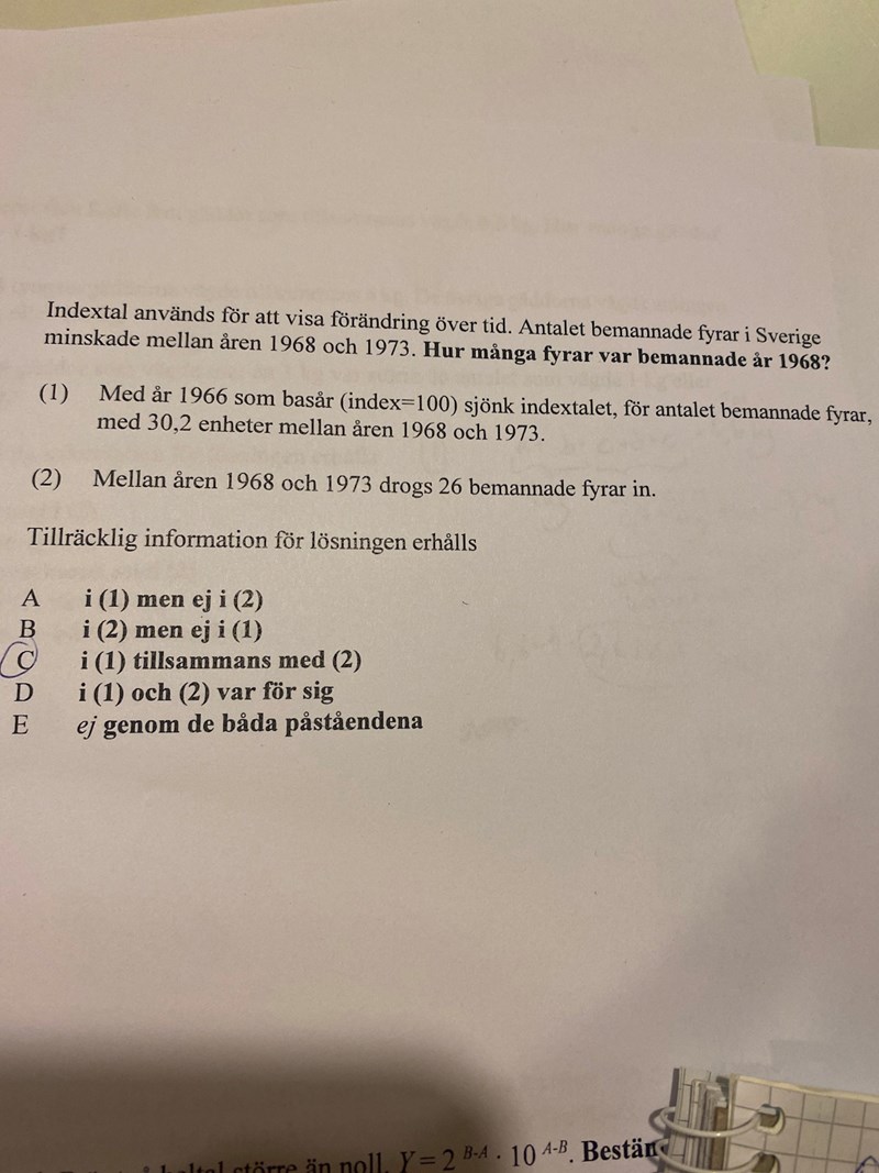 Hej! Jag undrar varför det inte går att beräkna uppgiften mha informationen i (1) och (2) tillsammans. Om index för 1968 är y så är index för 1973 (y-30,2) sedan tänkte jag att i (2) får man ju reda på att det mellan 1968 och 1973 sker ett bortfall av 26 fyrar. Då tänkte jag att man slår ihop (1) och (2) och att därför en minskning av 30,2% innebär en ekvivalent minskning av 26 st fyrar. Och därför motsvarar 100% ca 87 fyrar. Vilket är det totala antalet fyrar (y) för år 1968?