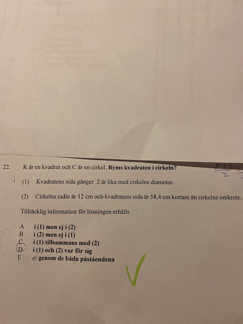 I (2) räknade jag ut cirkelns omkrets vilket blev ca 75,36 cm. Sedan beräknade jag kvadratens sida x=75,36-58,4=16,96 cm. Men sedan tycker jag det är konstigt för att kvadratens sida ska ju precis som i (1) bli hälften så står som cirkelns diameter men det blir den inte i (2). Jag tycker därför det är svårt att förstå (2) och kunna avgöra om kvadraten får plats i cirkeln.