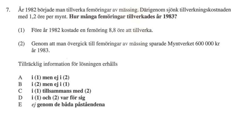 I information (2) står det hur mycket man sparade, och i grundinformationen att man sparade 1,2 öre per mynt. Jag får då att man tillverkade 50'000'000 fler mynt. Men jag vet inte om det besvarar frågan om ”hur många mynt som tillverkades”, då vi inte har information om tillverkningskostnaden, utan endast 1,2-x ifrån grundinformationen.