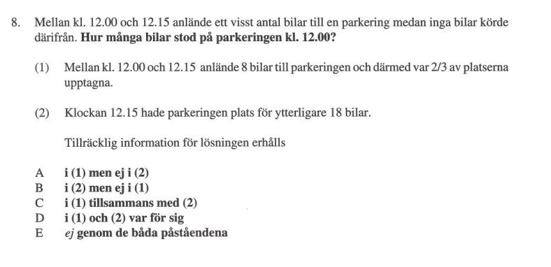 Jag tror att det är svårt att veta hur många bilar som fanns där ifrån början (kl 12.00), eftersom vi inte vet om det fanns bilar innan kl 12.00, eller hur? Det nämns bara om bilarna som anlände, så hur vet man andelen ifrån information (1)? Facit säger att C är rätta svaret.