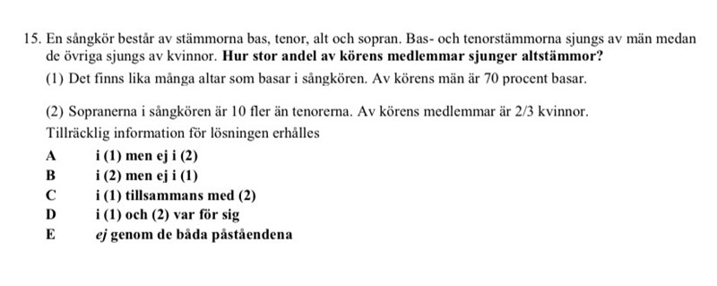 Hej! Jag håller på att gå igenom gamla NOG uppgifter för att lära mig riktigt ordentligt och därför undrar jag hur man går tillväga för att beräkna ett svar på denna. Har försökt med algebra och ekvation men får inte fram antalet Alt- stämmor. Jag ställde upp svaret så här= a/(b+t+a+s) och sen från (1) får jag ekvationen b=a och även b=0,7•(b+t) och i (2) får jag ekvationen s=t+10 och även kvinnor=(2(b+t+a+s))/3. Men jag vet inte riktigt hur jag ska använda alla ekvationer, någon som vill klargöra det för mig. Tack!