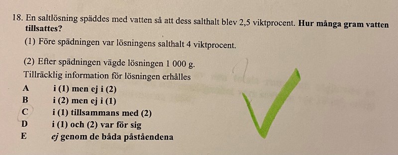 Jag tänkte såhär: (1) Saltets gamla vikt= 0,04•gamla totalvikten och i (2) Saltets nya vikt= 0,025•1000=25 g och därför kan jag beräkna vattnets nya vikt vilket är 1000-25=975 g
